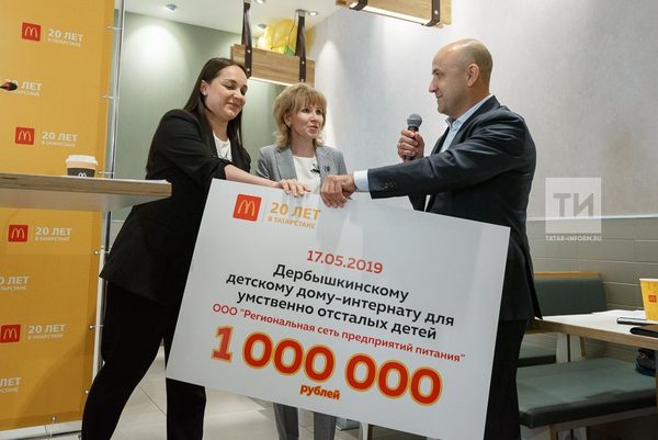 Основатель «Макдоналдс» в России Хамзат Хасбулатов и гендиректор ООО «Региональная сеть предприятий питания» Александр Калинин вручили сертификаты по 1 млн рублей Дербышкинскому детскому дому-интернату для умственно отсталых детей и Казанской школе-интернату им. Е. Г. Ласточкиной для детей с ОВЗ. Деньги собрали в рамках благотворительной акции — один рубль с каждого заказа перечислялся в благотворительный фонд.